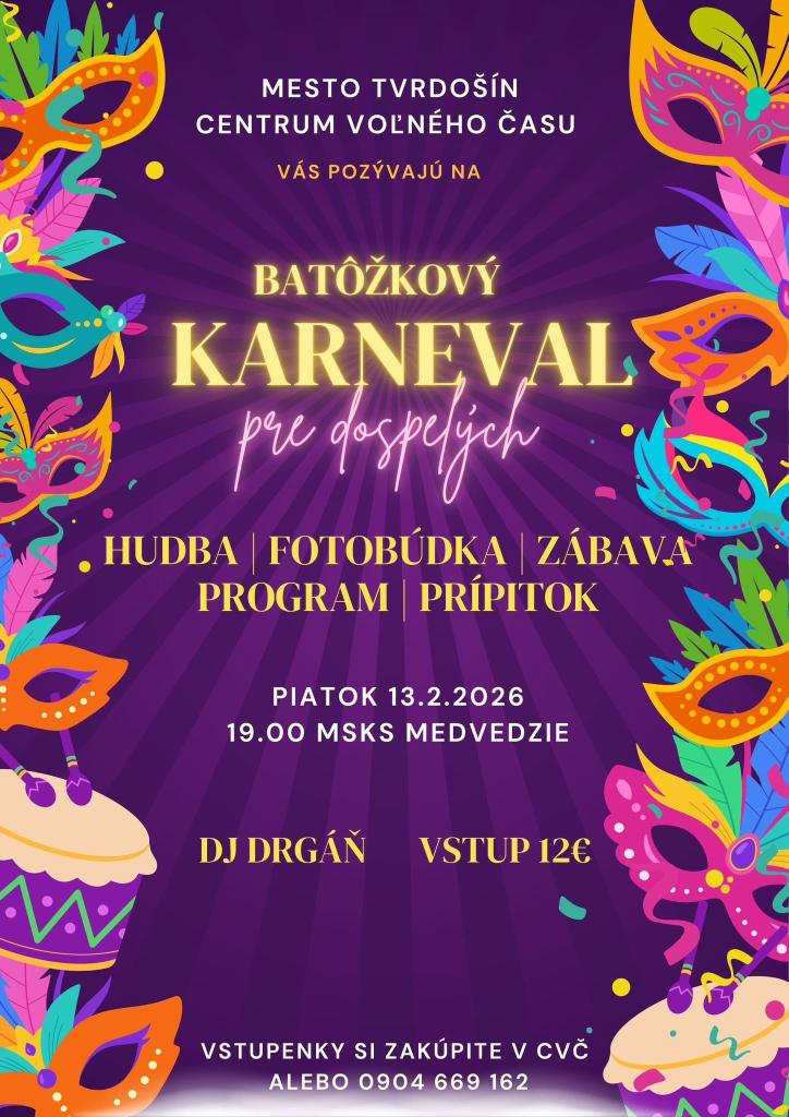 Mesto Tvrdošín a Centrum voľného času vás srdečne pozývajú na Batôžkový karneval pre dospelých v piatok 13. februára 2026 o 19:00 MsKS Medvedzie.