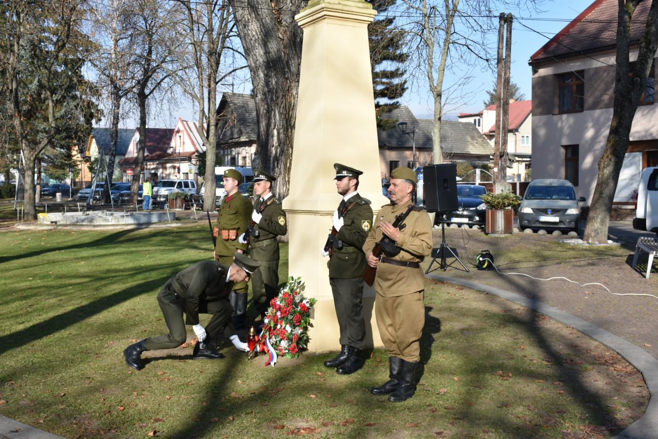 Kostolné zvony o 11:11 hod. zvonili na počesť padlým. Potom zaznela slovenská hymna, Mgr. Jaroslav Broz prečítal báseň Krvavé sonety od Pavla Országha Hviezdoslava. Potom odzneli príhovory primátora Ivana Šašku a Bernarda Adámusa, ktorí pripomenuli dôvod a zmysel tejto spomienky. Vojaci položili k pamätníku veniec z červených makov.
