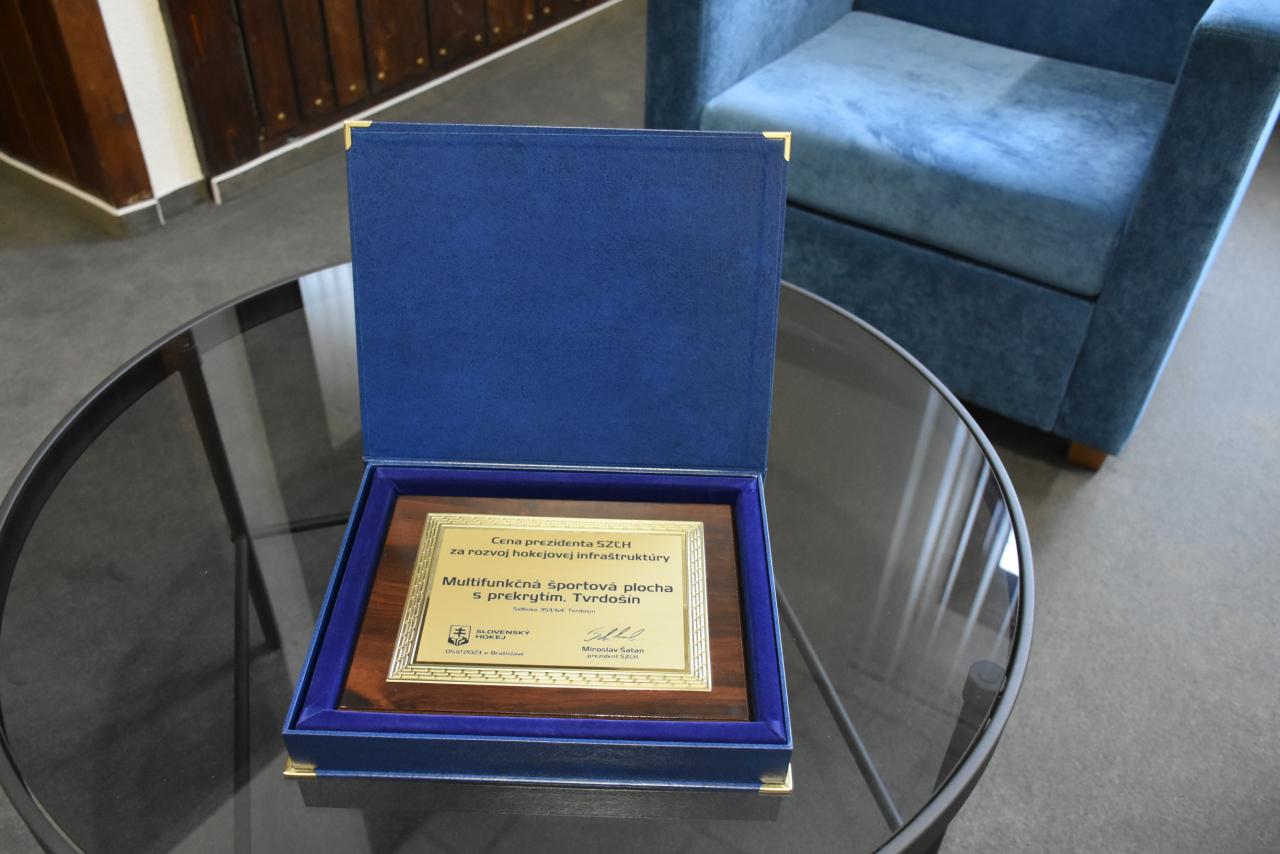plaketaPrezident Slovenského zväzu ľadového hokeja Miroslav Šatan, odovzdal Cenu prezidenta SZĽH za rozvoj hokejovej infraštruktúry vo našom meste - Multifunkčná športová plocha s prekrytím, Tvrdošín.
